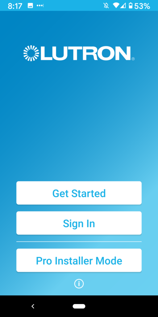 8. If you want to regain access or someone else new to your home needs to get set-up in the app, they would start here. Go to the homescreen on Lutron app and click “Get Started.”