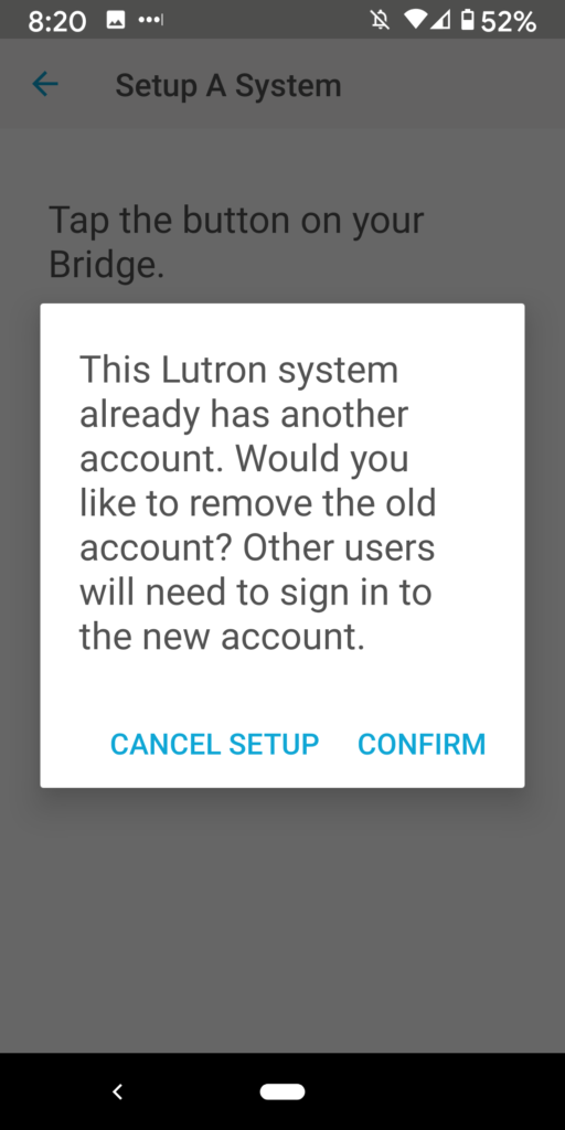 16. You will receive the following message: “This Lutron system has another account. Would you like to remove the old account? Other users will need to sign into the new account.” Select “Confirm.”