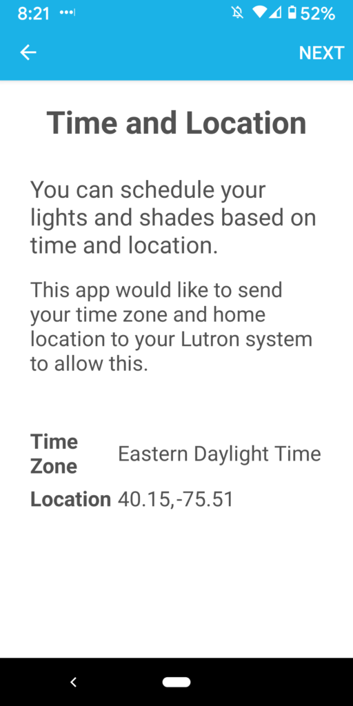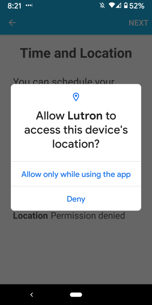 18. You will be asked “Allow Lutron to access this device’s location?” Select first option: “Allow only while using this app.”